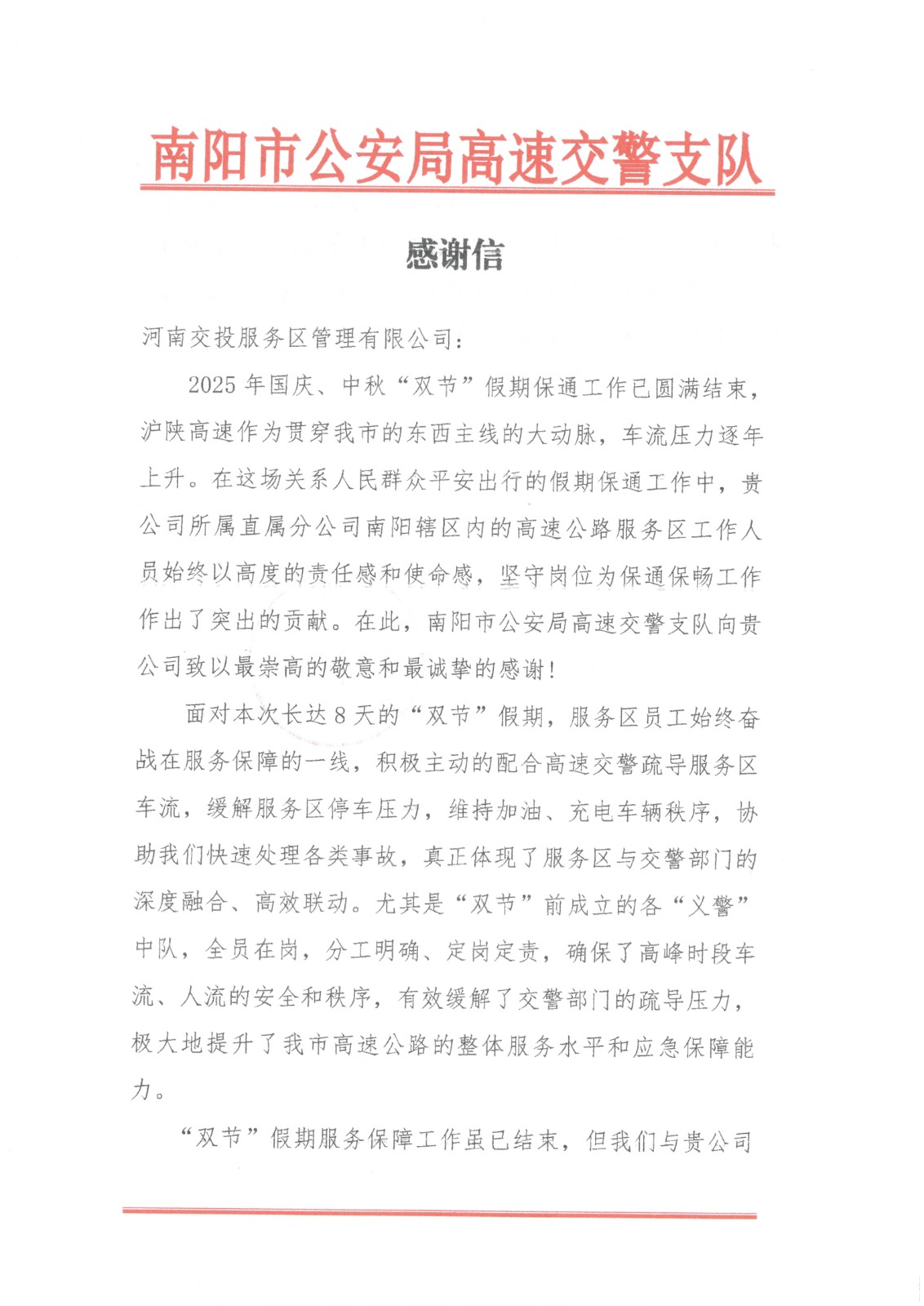 《一封感謝信 濃濃服務(wù)…》 10月10日,南陽市公安局高速交警支隊向公司所屬直屬分公司寄來感謝信,表達(dá)對南陽轄區(qū)內(nèi)…